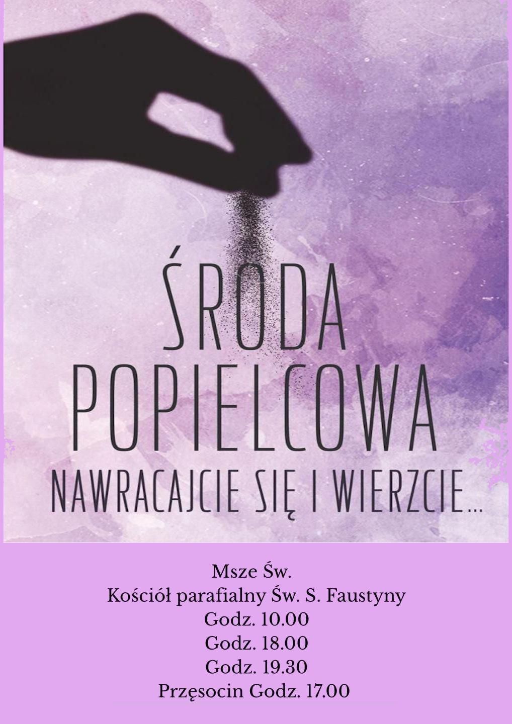 2. Kończy się już tegoroczny karnawał. W tym tygodniu, 18 lutego, przypada Środa Popielcowa. Otwiera ona święty, szczególny czas Wielkiego Postu. Msze Święte tego dnia w kościele parafialnym o godz.: 10.00; 18.00 i 19.30, a w Przęsocinie o godz. 17.00. Zewnętrznym znakiem naszego wejścia na drogę pokuty i nawrócenia jest posypanie głowy popiołem.